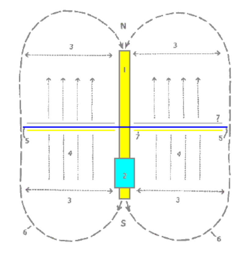这里,带有南极和北极分量的偶极子标识为1。2是谐振高压感应线圈。3表示偶极子发射的电磁波的位置。4表示感应线圈2引起的能量流的海维赛德电流分量的对应位置和流向。5是电容器极板7的介电分离器。6是此图的目的,表示电磁波能量范围的虚拟的限制。