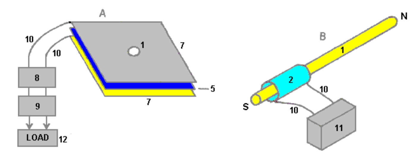 In Fig.2A 1 is the hole in the capacitor plates through which the Dipole is inserted and in Fig.2B it is the Dipole with its North and South poles shown. 2 is the resonant high-voltage induction coil surrounding part of the Dipole 1. The dielectric separator 5, is a thin sheet of plastic placed between the two capacitor plates 7, the upper plate being made of aluminium and the lower plate made of copper. Unit 8 is a deep-cycle battery system powering a DC inverter 9 which produces 120 volts at 60 Hz (the US mains supply voltage and frequency, obviously, a 240 volt 50 Hz inverter could be used here just as easily) which is used to power whatever equipment is to be driven by the device. The reference number 10 just indicates connecting wires. Unit 11 is a highvoltage generating device such as a neon transformer with its oscillating power supply.