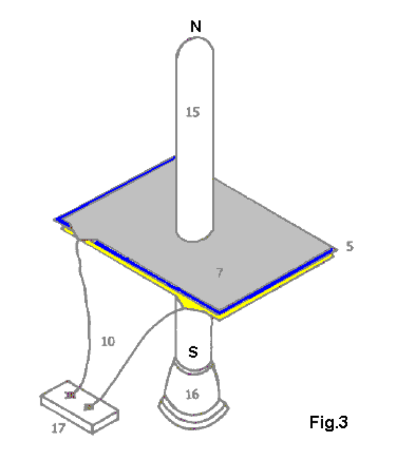 图.3是一台使用等离子体管作为有源偶极子的主要装置的证明。在该图中,5是电容的两个极板7的塑料片状介电分离器,上板为铝制,下板为铜制。连接导线标为10而等离子体管标注为15。等离子体管四英尺(1.22米)长,直径六英寸(100毫米)。有源等离子偶极的高压电源标为16,而显示的连接盒17是便于测试装置时连接电容器极板用的。