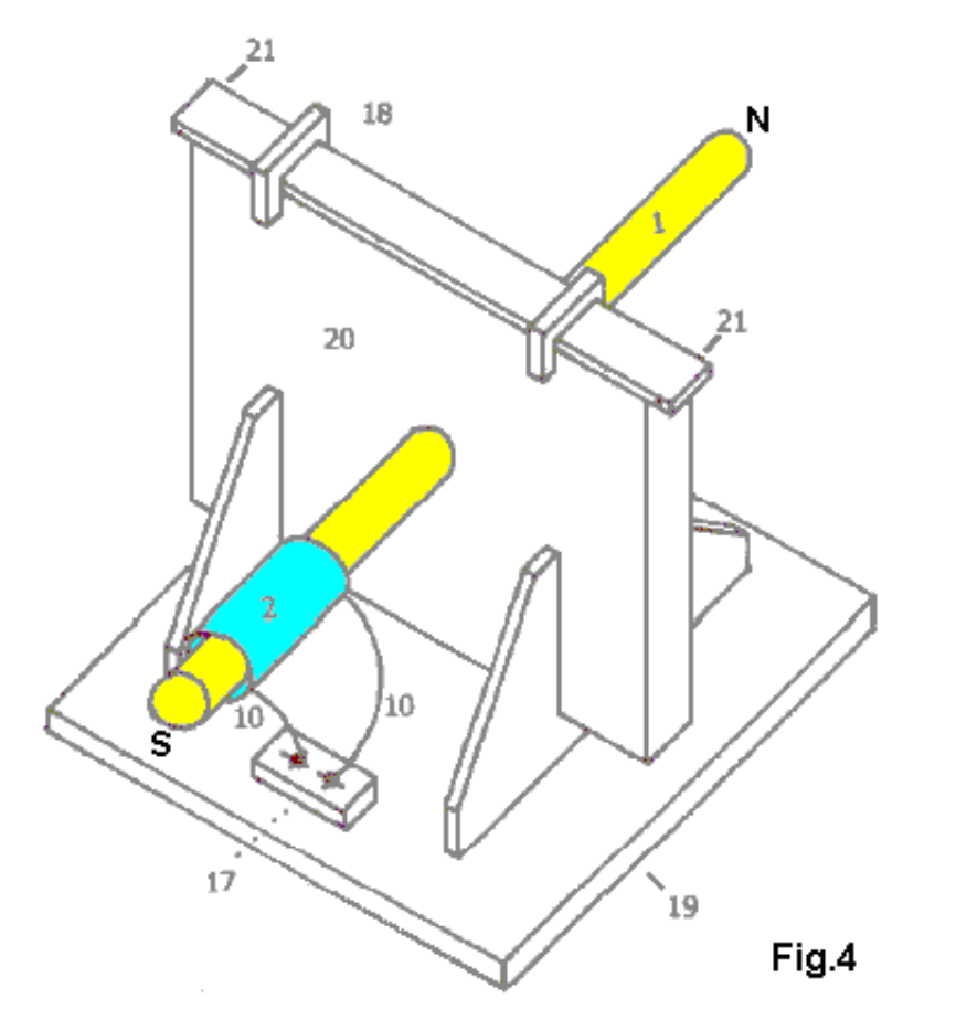 Fig.4 shows a Manufacturer’s Prototype, constructed and fully tested. 1 is a metal Dipole rod and 2 the resonant high-voltage induction coil, connected through wires 10 to connector block 17 which facilitates the connection of it’s high-voltage power supply. Clamps 18 hold the upper edge of the capacitor packet in place and 19 is the base plate with it’s supporting brackets which hold the whole device in place. 20 is a housing which contains the capacitor plates and 21 is the point at which the power output from the capacitor plates is drawn off and fed to the DC inverter.