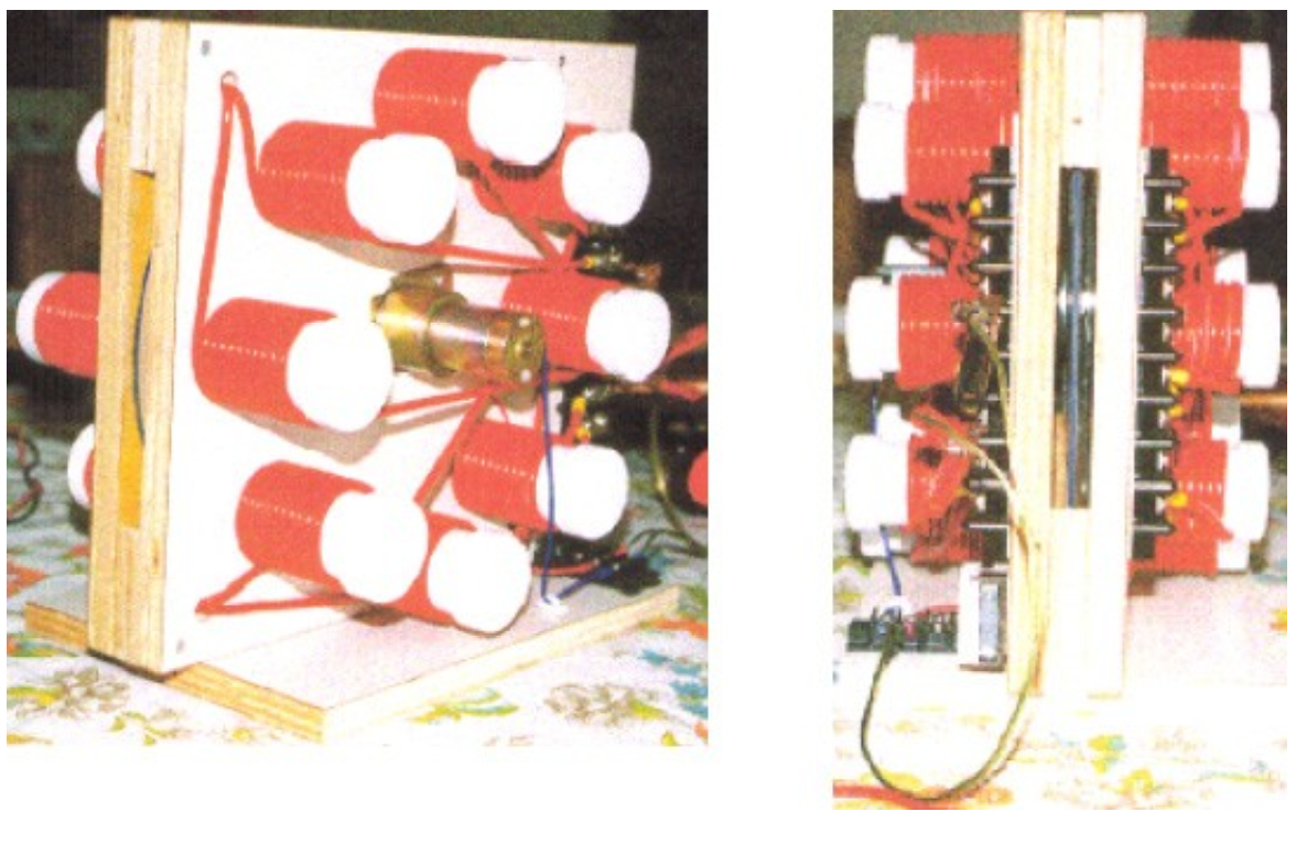 This is a small table-top device which looks like it is an experiment by a beginner, and something which would be wholly ineffective. Nothing could be further from the truth. Each of the eight coils pairs (one each side of the rotating disc) produces 1,000 volts at 50 amps (fifty kilowatts) of output power, giving a total power output of 400 kilowatts. It’s overall size is 16” x 14.5” x 10” (400 x 370 x 255 mm). In spite of the extremely high power output, the general construction is very simple: