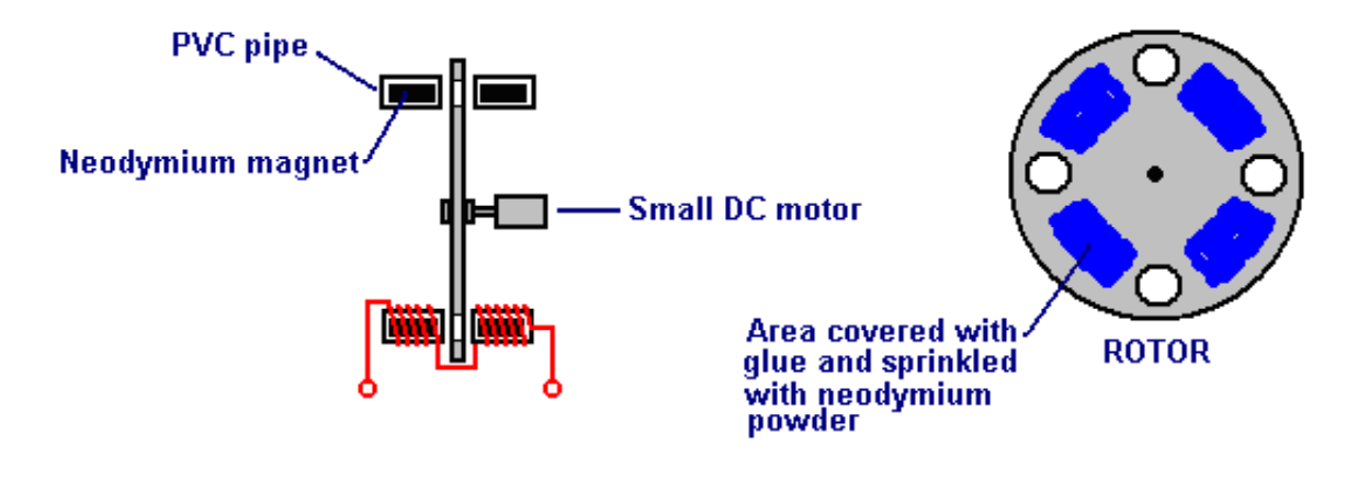 The device operates on a fluctuating magnetic field which is produced by a small lowpower DC motor spinning a plastic disc. In the prototype shown above, the disc is anold vinyl record which has had holes cut in it. Between the holes is an area which was covered with glue and then sprinkled with powdered neodymium magnet material. It takes very little power to spin the disc, but it acts in a way which is very much like the Ecklin-Brown generator, repeatedly disrupting the magnetic field. The magnetic field is created by a neodymium magnet in each of the sixteen plastic pipes. It is important that the change in the magnetic flux between the matching magnets on each side of the disc is as large as possible. The ideal rotor material for this is “Terfenol-D” (tungsten zirconate) with slots cut in it but it is so expensive that materials like stainless steel are likely to be used instead