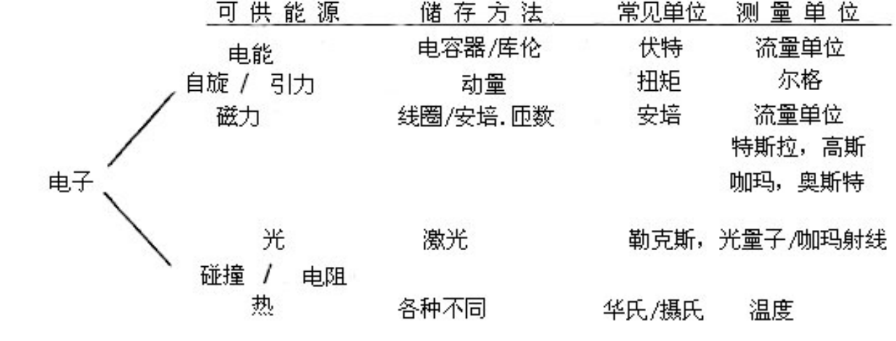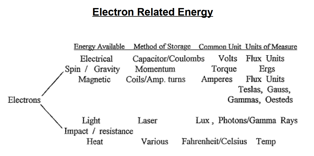 有两种电能,“潜能”和“有用能”。所有电能都是“潜能”,直至它们被转换。电子的共振流通激活了无处不在的电子潜能。共振频率通流率的强度/CPS(每秒电子数),设置可用的能源。这必须被转换成正在使用的设备所需的物理尺寸。例如,来自太阳的能量是磁通量,由太阳能电池转换成直流电,然后进一步转换成适于它所提供能量的设备的形式。只有磁通从点“A”(太阳)转移到点“B”(地球)。所有电能系统的工作方式完全相同。线圈和磁体的运动在点“A”(发电机)流动电子,继而激发在点“B”(你的住宅)的电子。根本没有点“A”的电子源源不断地传送到点“B”。在这两种情况下,电子永远保持完整无损,并且可用于进一步通流。这是牛顿物理(电气力学和守恒定律)所不允许的。显然,这些定律把人搞糊涂了而且是不充足的。