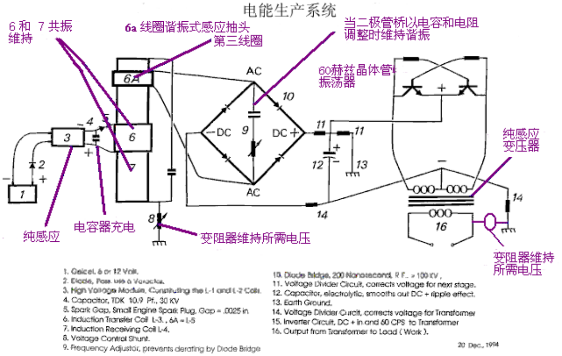 我注意到任何一台机器都可以通过添加一个跨接线圈的双极性电容器而做成一个超级机器。其它什么都不需要了。用正确的电容器,线圈成为自然谐振,并使用非常小的电流。每台机器使用不同大小的电容器。正确电容大小可以通过以线圈的线长除光速来计算,首先要获得的线圈自然频率,然后用频率除所用的电压。结果得出正确大小的电容。你的机器于是将会非常强大,甚至能用一个12伏的汽车电池运行而无需补充其它什么东西。
