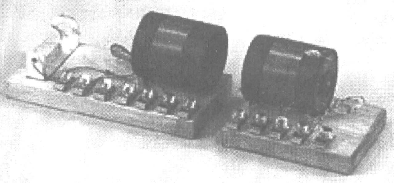 5.连接到线圈的开始。为确定线圈上的确切的谐振点,做了一个测量。现成的万用表对高频信号不响应,用一个便宜的氖管来代替。一手持氖管的一根线,而另一根氖管线则沿L-2绕组的外面行走,找到最亮点的位置。然后沿着那个线匝移动氖管去寻找在那匝上的最亮点,当找到后,对这个绕组做一个确切的连接点。L-2现在是一个共振绕组了。可以通过略微扩展线匝来提高线圈的效能(“Q”),而不是把它们定位得每一都与相邻匝接触。