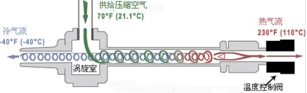 经过压缩并冷却到常温的气体进入喷嘴,在喷嘴中膨胀并加速到音速,从切线方向射入涡流室,形成自由涡流。自由涡流的旋转角速度愈靠近中心愈大,由于角速度不同,在自由涡流的层与层之间就产生了摩擦。中心部分的气流角速度最大,摩擦结果是将能量传递给外层角速度较低的气流,中心层部分的气流失去能量,动能低,速度降低,温度降低,通过涡流管中心的孔板从一端引出,得到制冷需要的冷气流。而外层部分的气流获得动量,动能增加,同时又与涡轮管壁摩擦,将部分动能转换成热能,从涡流管的另一端通过控制阀被引出,形成热气流。可以通过控制控制阀,调节冷热两股气流的流量和温度。